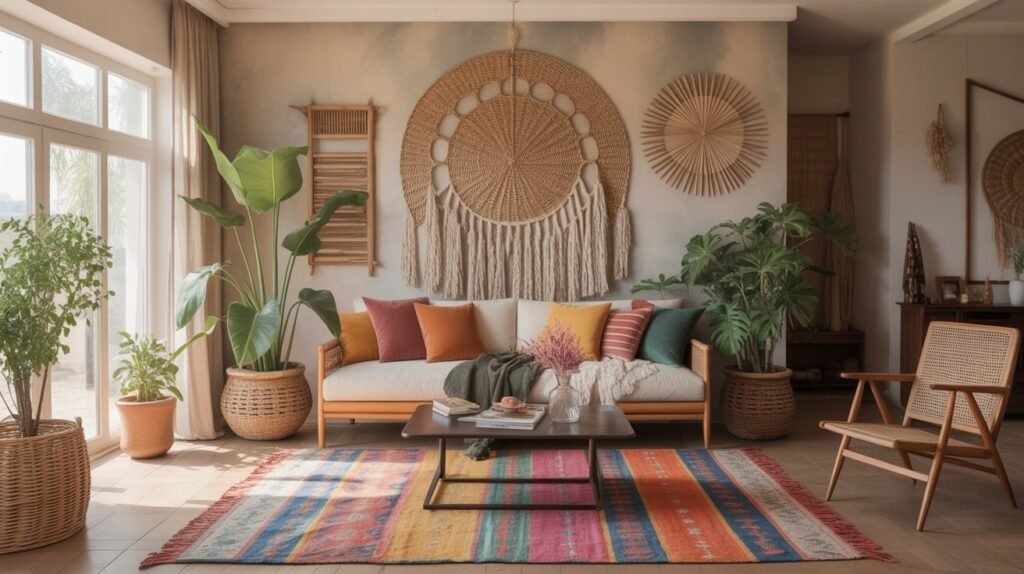 Layering textures and patterns is the heart of a bohemian living room. Mixing rugs, cushions, throws, and wall hangings with different patterns, fabrics, and colors creates depth and visual interest. Don’t shy away from combining ethnic prints, geometric designs, and floral motifs—boho style thrives on eclectic yet balanced layering.