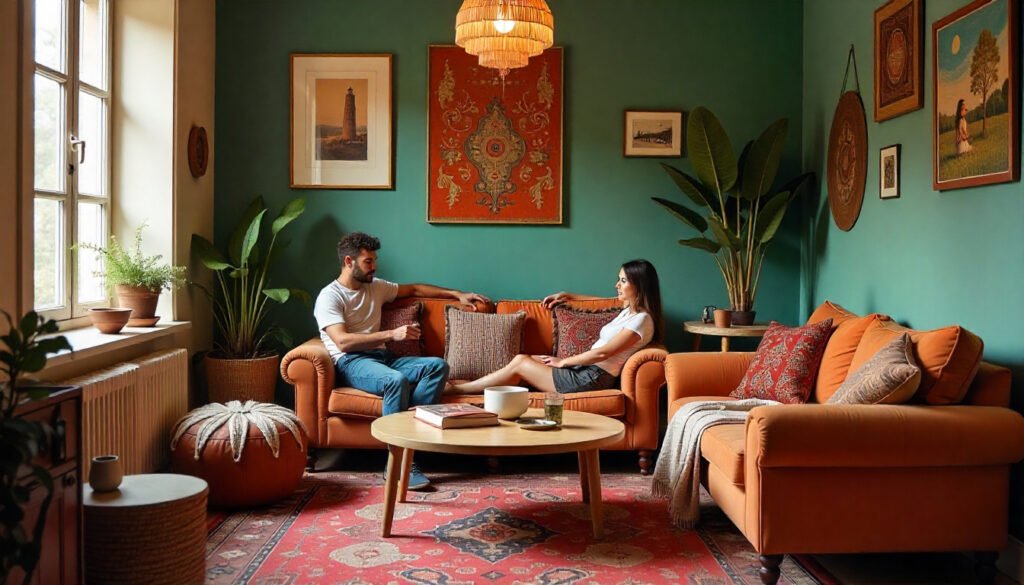 A true bohemian living room thrives on color, emotion, and fearless expression. Bold hues like deep teal, burnt orange, mustard yellow, and rich burgundy instantly energize the space and reflect a free-spirited lifestyle. These colors don’t just decorate a room—they awaken creativity and make your living room feel alive, warm, and deeply personal.