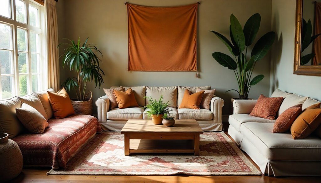 Terracotta, mustard, olive, cream, and warm browns form a cozy boho palette.
