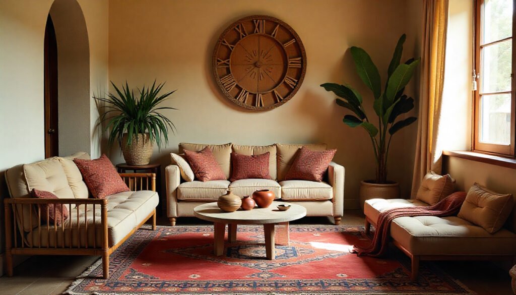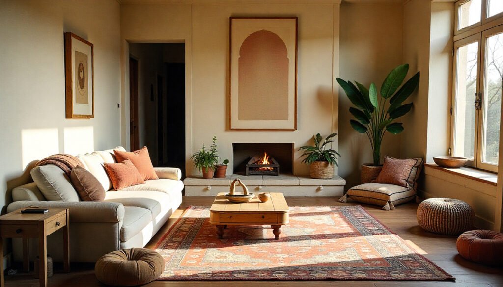 Bohemian style thrives on contrast and comfort. Mix tactile materials such as cotton, linen, wool, jute, and macramé to create visual interest without feeling overwhelming. A textured area rug—think Moroccan, tribal, or vintage-inspired—anchors the room and instantly adds personality. The beauty of boho is that nothing has to match perfectly; harmony comes from feeling, not rules.