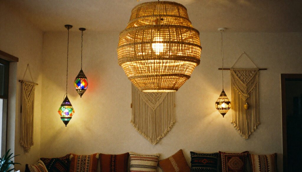 Statement lighting instantly elevates a bohemian living room. Think large pendant lamps, rattan chandeliers, or colorful Moroccan lanterns that create warmth and draw the eye.