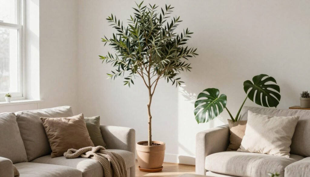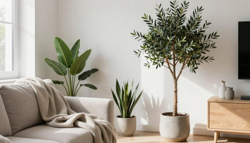 Choose plants with simple shapes—like a fiddle-leaf fig, snake plant, olive tree, or monstera. These plants add character without overwhelming the room. Avoid crowding multiple small plants together, as this can make the space look busy. Instead, opt for a few intentional pieces placed where they naturally complement the room’s layout.