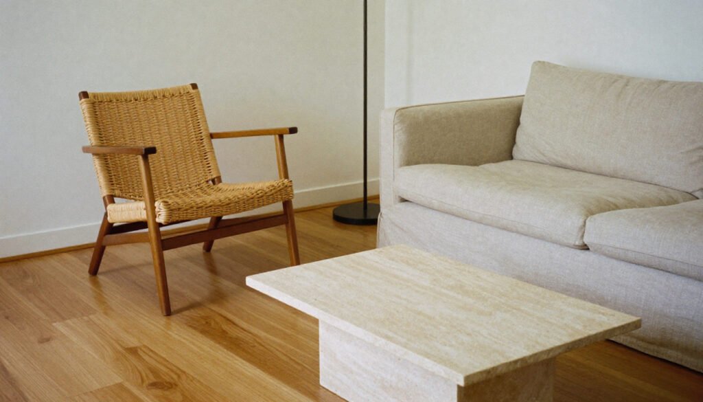To make a minimalist living room feel cozy instead of cold, natural materials are essential. Wood, rattan, wool, stone, and linen instantly add warmth and texture without cluttering the space. These organic elements introduce a sense of grounding and calm, making the room feel more inviting while still maintaining a clean aesthetic.