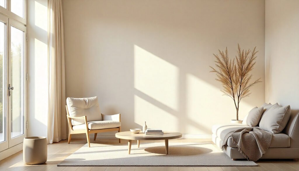 Consider adding depth through textiles like woven throws, natural rugs, and textured pillows in matching tones. These elements bring warmth without compromising the minimalist aesthetic, making your living room feel serene yet inviting.