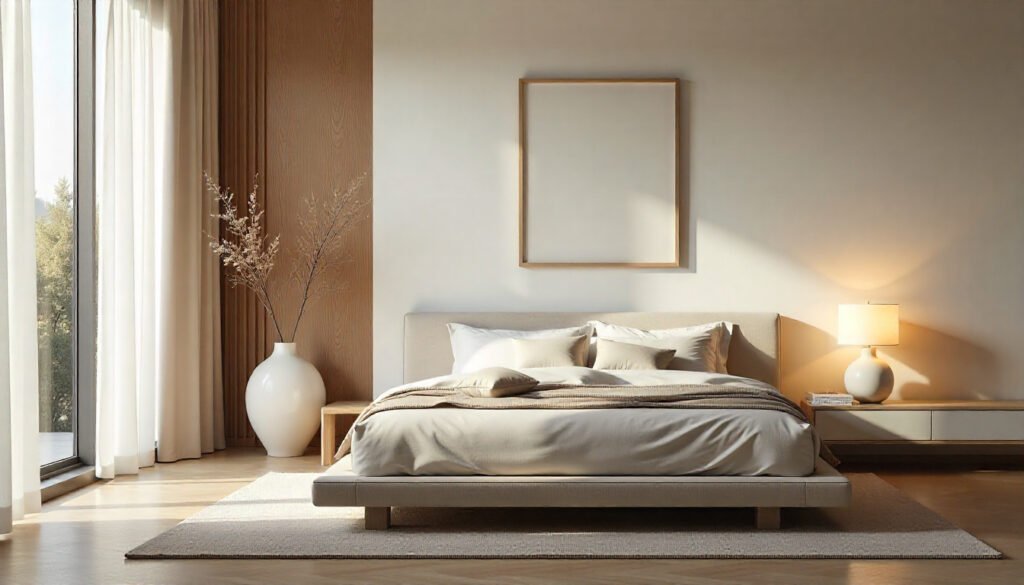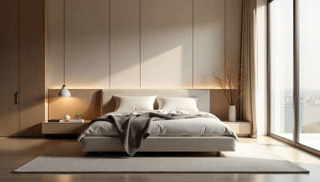 Soft furnishings play a powerful role here. Luxurious bedding in high-quality fabrics, a neatly draped throw, or textured accent pillows add depth without visual noise. Choose tones that blend seamlessly with your palette—soft greige, warm taupe, muted blush, or charcoal—to maintain harmony. Even bedside styling matters: a sleek lamp, a minimalist book stack, or a ceramic tray can elevate the entire look.