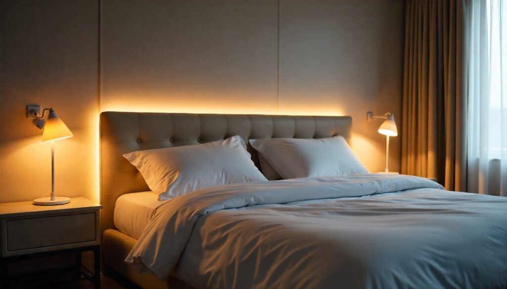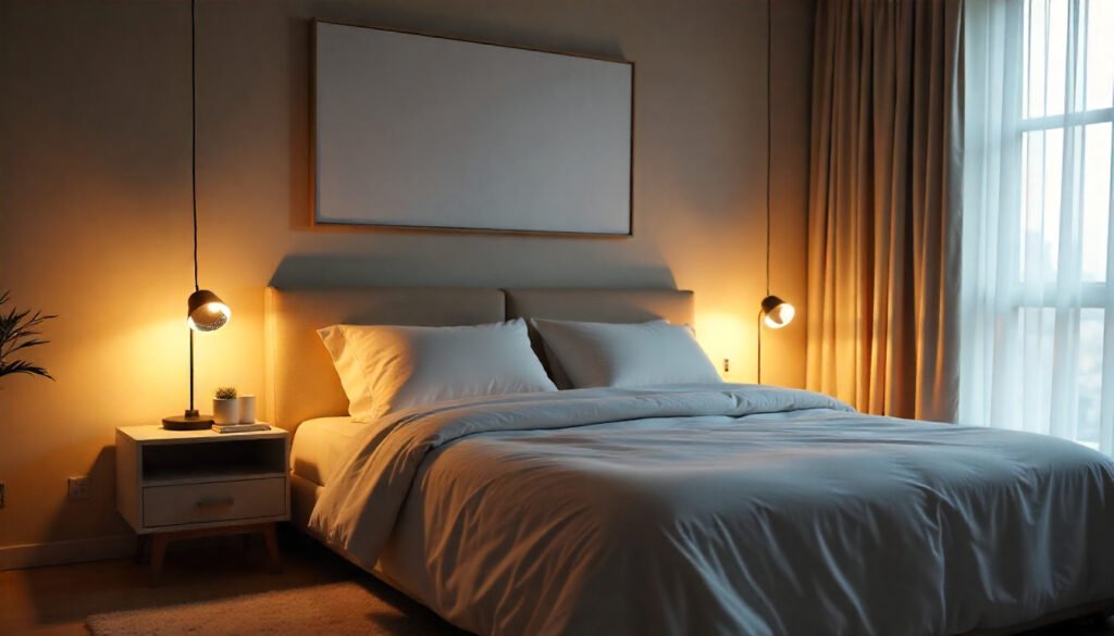 Wall-mounted sconces, pendant lights, or slim-profile bedside lamps add a refined, hotel-inspired elegance while freeing up surface space. Soft, warm lighting tones reduce visual stress and create a soothing atmosphere that naturally encourages rest. Dimmable lights are especially effective, allowing you to shift from bright morning energy to a gentle evening glow with ease.