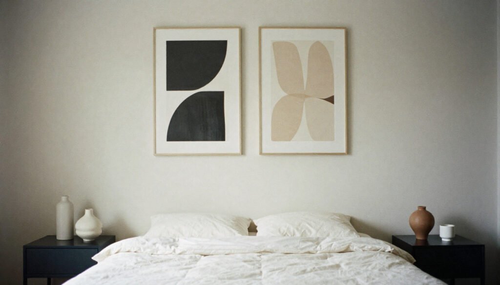Stick to a restrained color palette and clean forms when adding decor. Abstract art, soft photography, or line drawings work beautifully in modern bedrooms because they add interest without visual noise. One thoughtfully placed piece often has more impact than many scattered items.