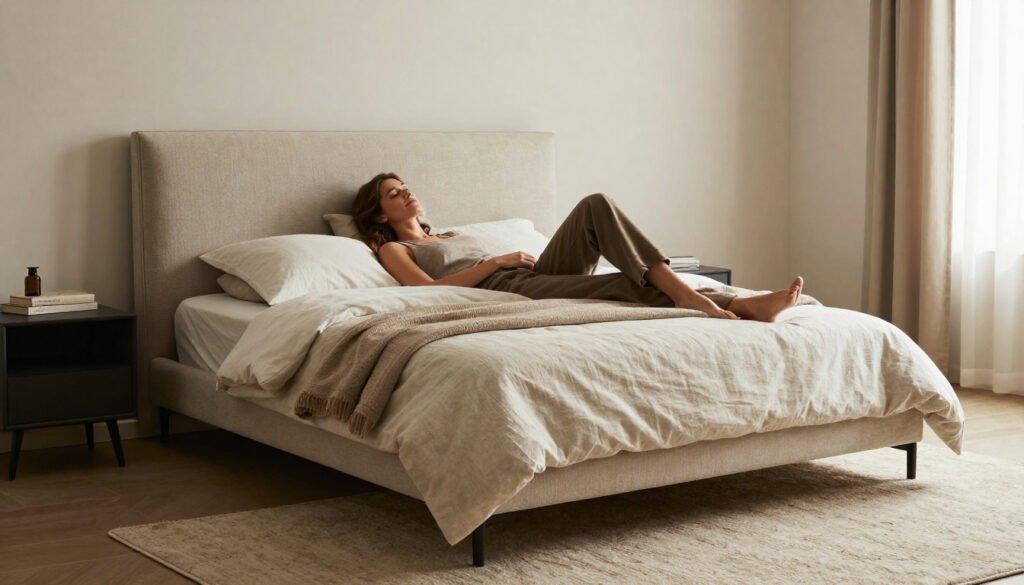 Neutral-toned throws, lightly textured cushions, and matte fabrics create a calming sensory experience. These elements soften sharp lines and modern finishes, helping the room feel peaceful and restorative—perfect for rest and relaxation after a long day.