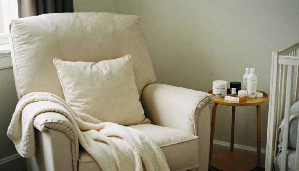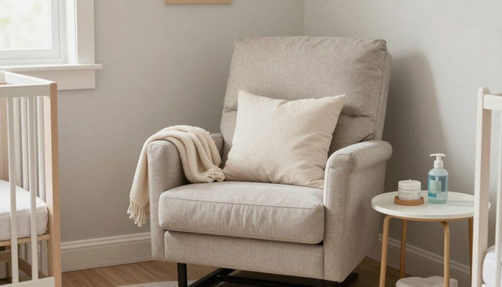 Start with a comfortable chair or glider with sleek, clean lines that fits the modern aesthetic. Add a soft throw blanket, cushioned pillow, and a small side table for essentials like water, books, or baby supplies. Layer lighting carefully with a soft floor lamp, wall sconce, or dimmable nightlight to create a gentle glow for late-night feedings or quiet reading sessions.