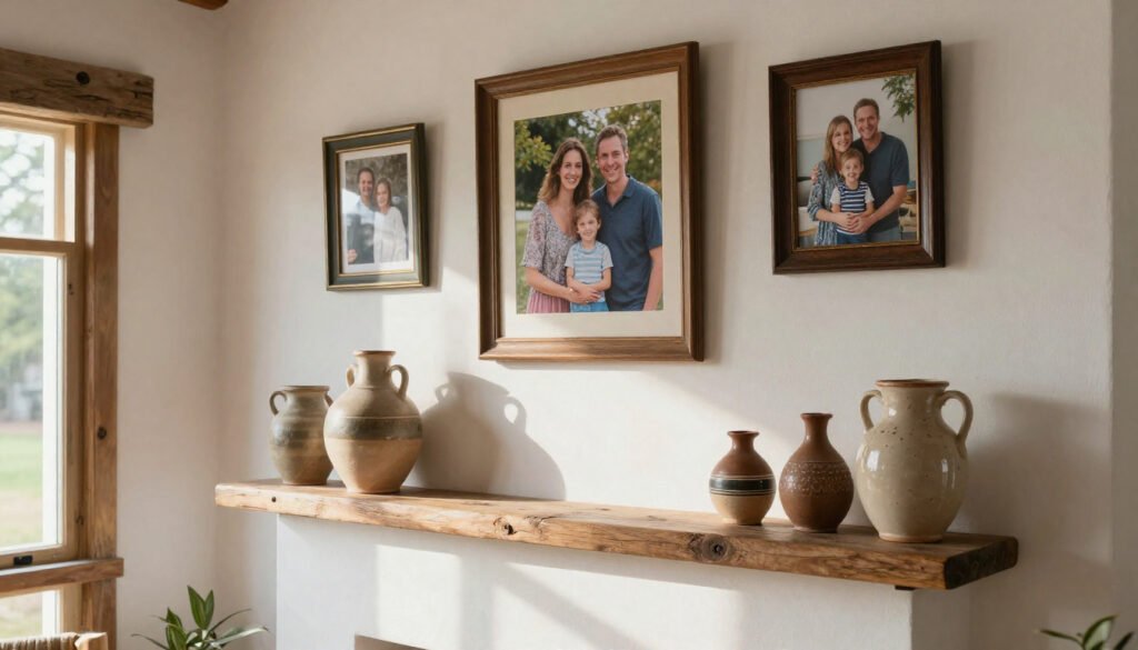 Add family photos, handmade pottery, vintage décor pieces, cherished books, and meaningful ornaments to make the space uniquely yours while enhancing the rustic charm.