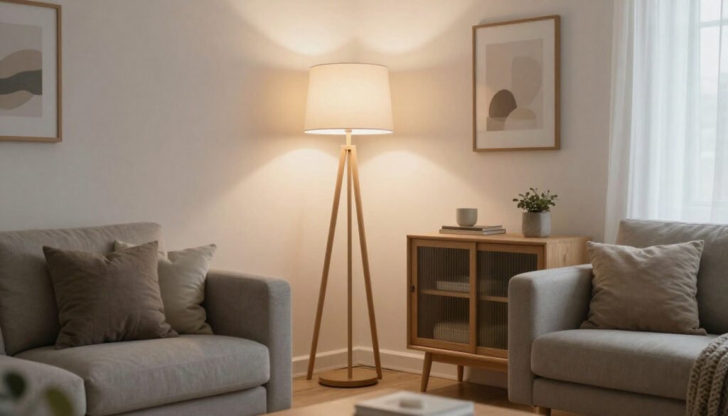 Choose warm white bulbs (2700K–3000K) and mix floor lamps, table lamps, wall sconces, and candlelight. A tall tripod floor lamp can brighten dark corners, while small table lamps add a soft glow that instantly warms the space. Scandinavian design also favors natural materials—think linen lamp shades, oak lamp bases, and matte finishes.