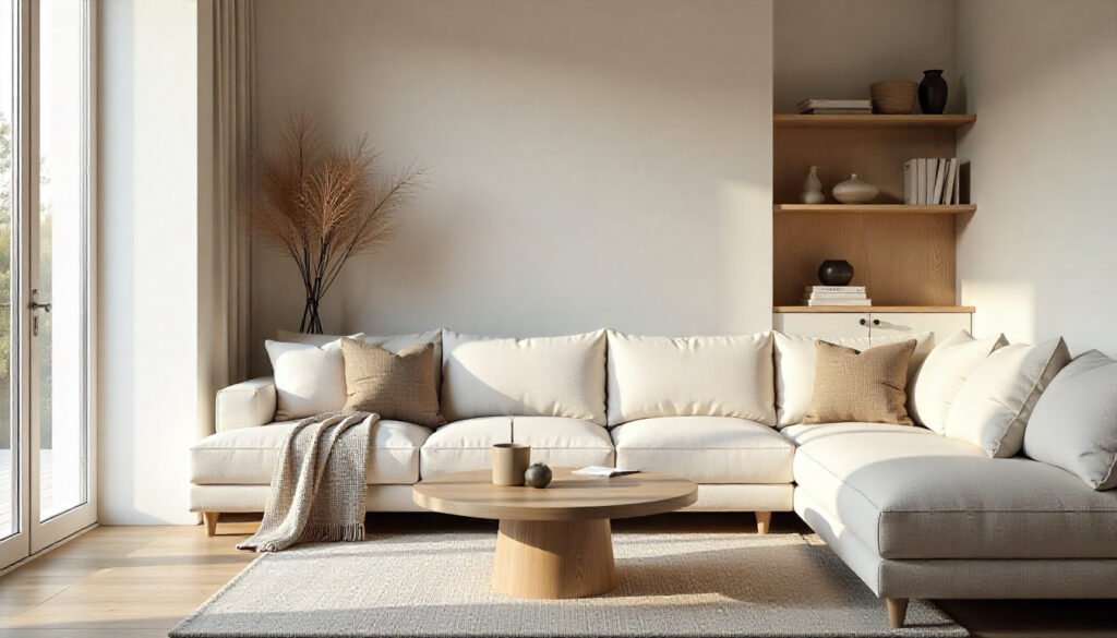 Start with a neutral foundation—like a linen sofa or an oversized cotton sectional—then add gentle layers using chunky knit blankets, faux sheepskin rugs, and soft cushions in muted tones. These textures create depth and warmth while keeping the space calm and uncluttered. The key is balancing comfort with simplicity, avoiding overly busy arrangements.