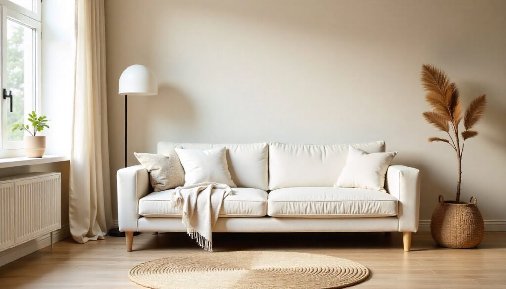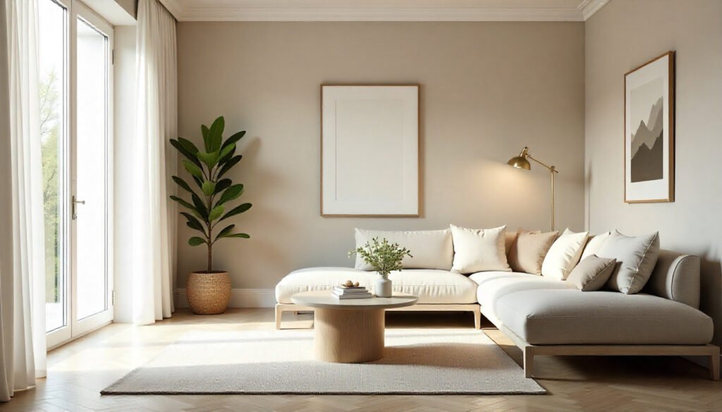 A cozy Scandinavian living room always begins with a soft, calming, and earthy color palette. Instead of bright whites alone, modern Scandi style blends layered neutrals that add warmth without disrupting the minimalist aesthetic. Think muted beige, oatmeal, warm greige, mushroom, ivory, light taupe, and soft clay tones.